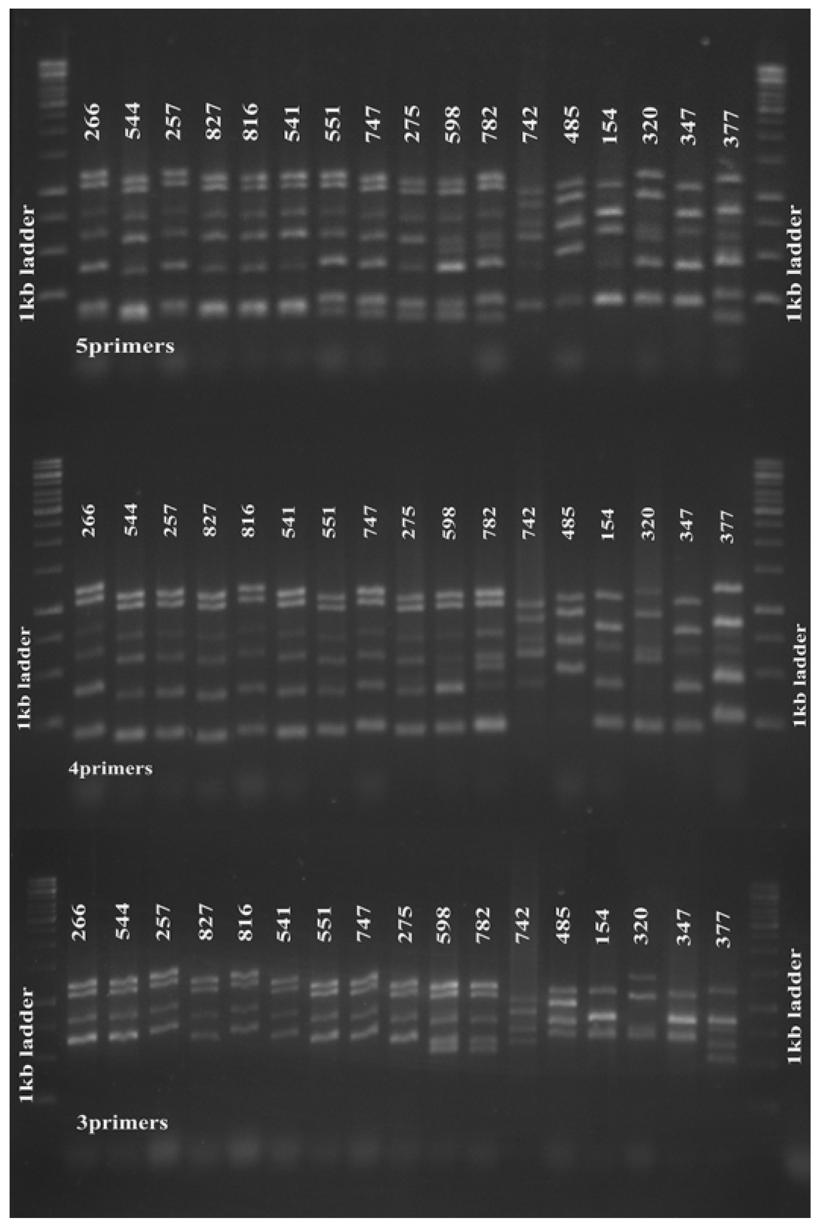 Figure 1. Five-primer-pair MLVA amplification of S. aureus. Five-primer-pair MLVA amplification clustered 17 tested MRSA strains isolated in 2009 according to their PFGE pulsotypes (upper panel). The 4-(middle panel) and 3-primer pair (lower panel) amplifications also clustered the strains accordingly. From left, strains 266–275 were of PFGE pulsotype P1, strains 598 and 782 were pulsotype P2, strains 742 and 458 were pulsotype P3; strains 154, 320, 347 and 377 were singletons. The 1 kb DNA Ladder (Promega Corporation) was used as a molecular weight marker.clustered 17 tested MRSA strains isolated in 2009 according to their PFGE pulsotypes (upper panel). The 4-(middle panel) and 3-primer pair (lower panel) amplifications also clustered the strains accordingly. From left, strains 266–275 were of PFGE pulsotype P1, strains 598 and 782 were pulsotype P2, strains 742 and 458 were pulsotype P3; strains 154, 320, 347 and 377 were singletons. The 1 kb DNA Ladder (Promega Corporation) was used as a molecular weight marker.