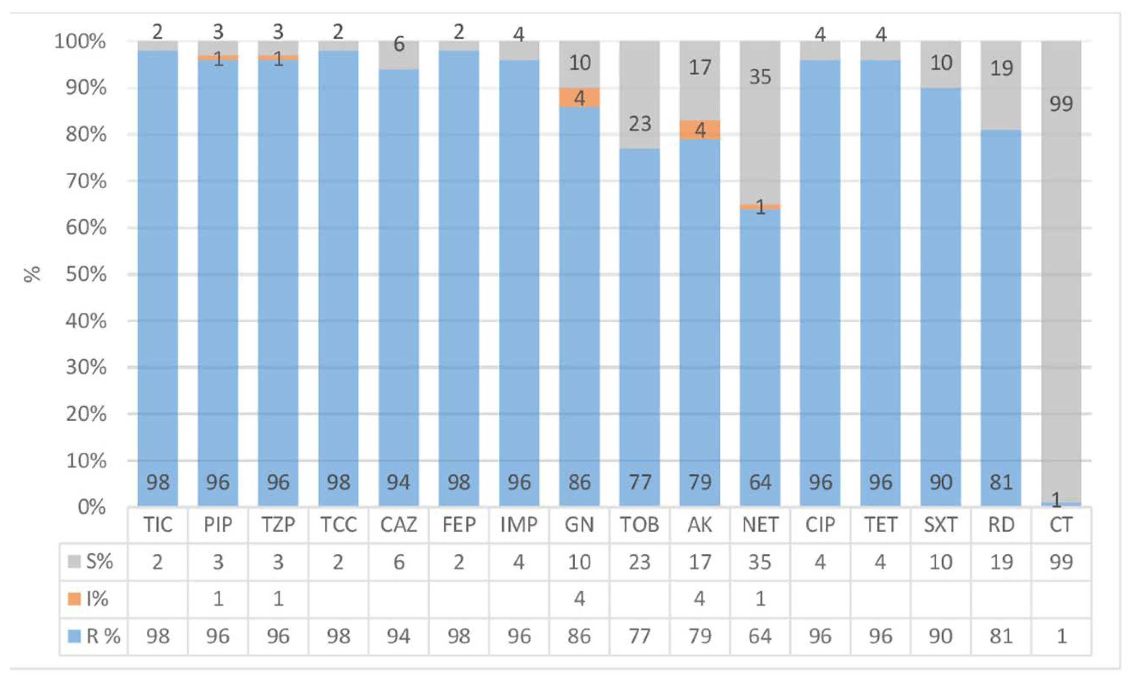 - Magiorakos, A.P.; Srinivasan, A.; Carey, R.B.; et al. Multidrug- resistant, extensively drug-resistant and pandrug-resistant bacteria: an international expert proposal for interim standard definitions for acquired resistance. Clin Microbiol Infect 2012, 18, 268–281. [Google Scholar]