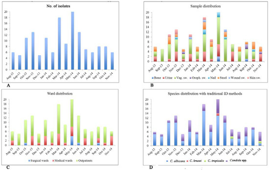 Graphical distribution of Candida spp. isolates collected from August 2013 to November 2014 (N=156). The strains are grouped on the basis of collection date (Panel A), sample type (Panel B), ward distribution (Panel C), and species distribution by traditional ID methods (Panel D).