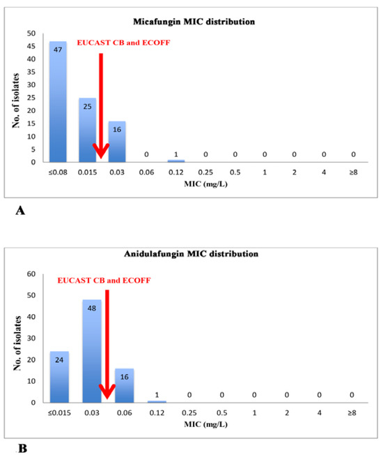 In addition to species-specific antifungal resistance patterns (Table 1), in our survey we detected a characteristic MIC distribution of C. albicans isolates for echinocandins: particularly, for both anidulafungin and micafungin, we noticed that 64 isolates out of 89 (71.9%) and 41 strains out of 89 (46.1%), respectively, showed a MIC value close to clinical breakpoint (Figure 3) and in this context it is important to underline that CB is equivalent to epidemiological cut-off (ECOFF) as defined by EUCAST [18,24]. Comparing our study with those of other Italian authors it is interesting to note that we found a higher percentage of C. albicans resistant to echinocandins (according to EUCAST) [25].