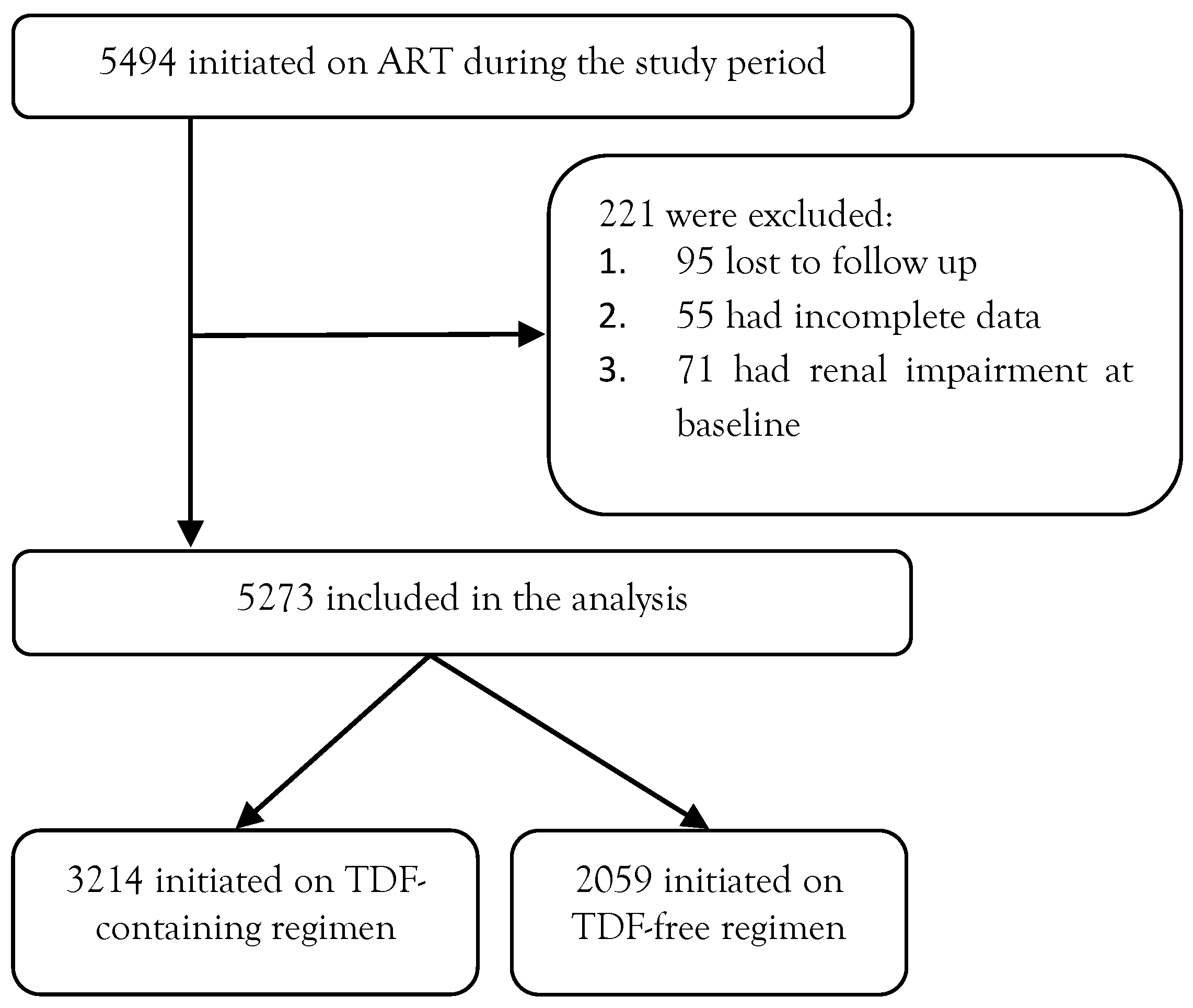 A total of 5494 patients were initiated on treatment during the study period. Ninety-five (95) subjects were excluded from the study on the basis of loss to follow up, 55 records were considered invalid and excluded from the analysis due to missing data (20 had no demographics, 17 without baseline SCR measurement, 18 with no baseline hepatitis B and C seropositivity results). Additionally, 71 subjects who had renal impairment at baseline (GFR <60 mL/min/1.73 sqm) were excluded. Therefore 5273 were included in the final analysis (Figure 1).