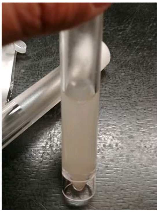 Opaque cerebrospinal fluid extracted during initial lumbar puncture from our patient.