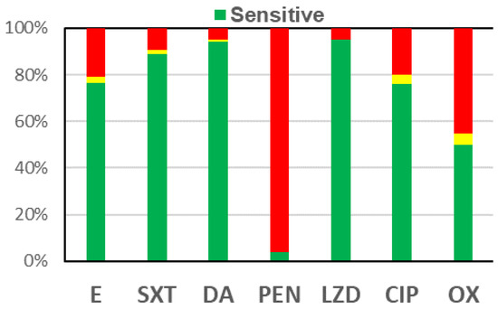 S. aureus (from nasal carriage) were detected. VRSA isolates were most resistant to ciprofloxacin (90.9%) and erythromycin (81.8%). Five isolates were resistant to all tested antibiotics: ciprofloxacin, clindamycin, erythromycin, linezolid, oxacillin, penicillin and trimethoprim-sulfamethoxazole. MRSA was found to constitute 43.8% of clinical