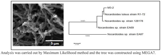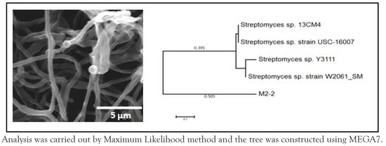Actinobacteria were isolated (M1-1, M2-2, M3-2) from sediment samples. Based on 16S rRNA gene analysis, isolate M1-1 was found to have only 90% identity percentage with