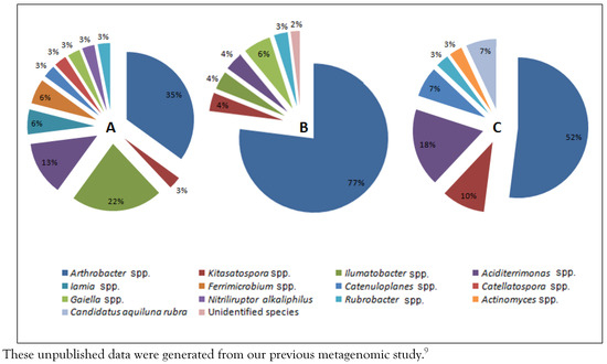 B. cereus ATCC 11778 (9 mm). There were no actinobacterial isolates obtained from water samples despite their significant diversity revealed by our previous metagenomic analysis, which showed the presence of 13 different species dominated by