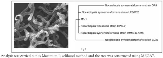 The phylum Actinobacteria represents one of the major taxonomic groups in the domain Bacteria with five subclasses, six orders, and fourteen suborders []. Most species of this phylum are Gram-positive with few exceptions [,]. Most species in this phylum are aerobic and chemoheterotrophic. In respect to morphology, various morphologies of Actinobacteria are present. However, the growth of some Actinobacteria is associated with the formation of hyphae of bacterial dimensions, less than half the size of fungal hyphae [,].