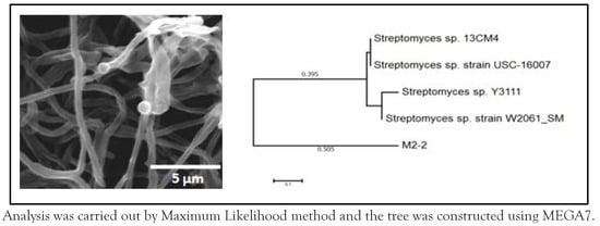 In respect to strain M2-2, it was found to be closely related to Streptomyces sp. (identity percentage = 97%; sequence length is 1136 nucleotides). Figure 2 shows the cellular morphology of strain M2-2 under scanning electron microscope and its phylogenetic relationship to the closest relatives.