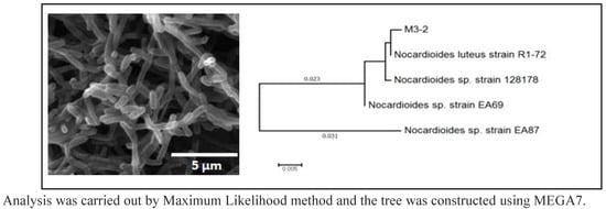 Moreover, strain M3-2 was found to be closely related to Nocardioides luteus (identity percentage = 99%; sequence length is 1105 nucleotides). Figure 3 shows cellular morphology of strain M3-2 under scanning electron microscope and its phylogenetic relationship to the closest relatives.