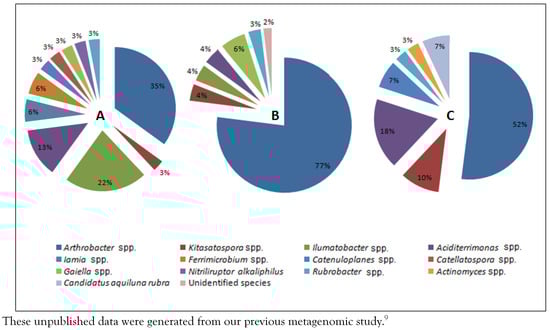 The data about actinobacterial diversity presented in this study are derived from our previous metagenomic analyses carried out by our group on Ma’in thermal springs (HS1, HS2, HS3) []. However, the metagenomic data presented in the results of this study were not published before and they are presented and discussed for the first time.