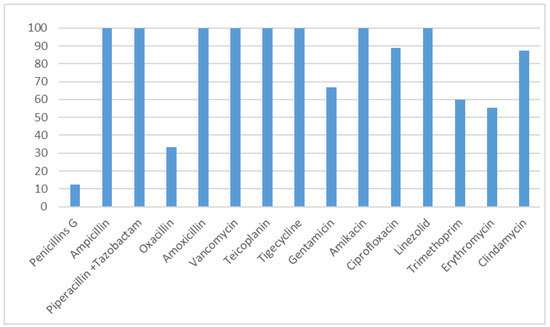 Regarding the antimicrobial sensitivity pattern among Gram positive organisms we found that (66.67%) of the isolates of Staphylococcus aureus were MRSA and that both Enterococcus gallinarum and Enterococcus faecalis were sensitive to penicillins. Vancomycin, tigecycline, teicoplanin and linezolid showed 100% susceptibility in all Gram positive isolates. This is presented in Figure 1.