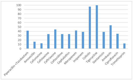 For Gram negative organisms, tigecycline was 100% active on tested isolates, while imipenem and meropenem were active on 38.71% and 41.93% of the isolates, respectively. In our study we found one isolate (Acinetobacter baumannii) which showed resistance to colistin. This is shown in Figure 2.