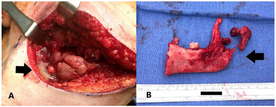 A. Purulence noted in the submandibular region (black arrow); B. Resected hemi-mandible. Note destruction of the condyle (black arrow).