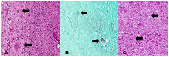 A. H&E stain, high power showing abundant neutrophils, giant cell reaction, and poorly-formed granulomas (black arrows); B and C. GMS and PAS stains showing yeast forms, some with broad based budding yeasts (black arrows).