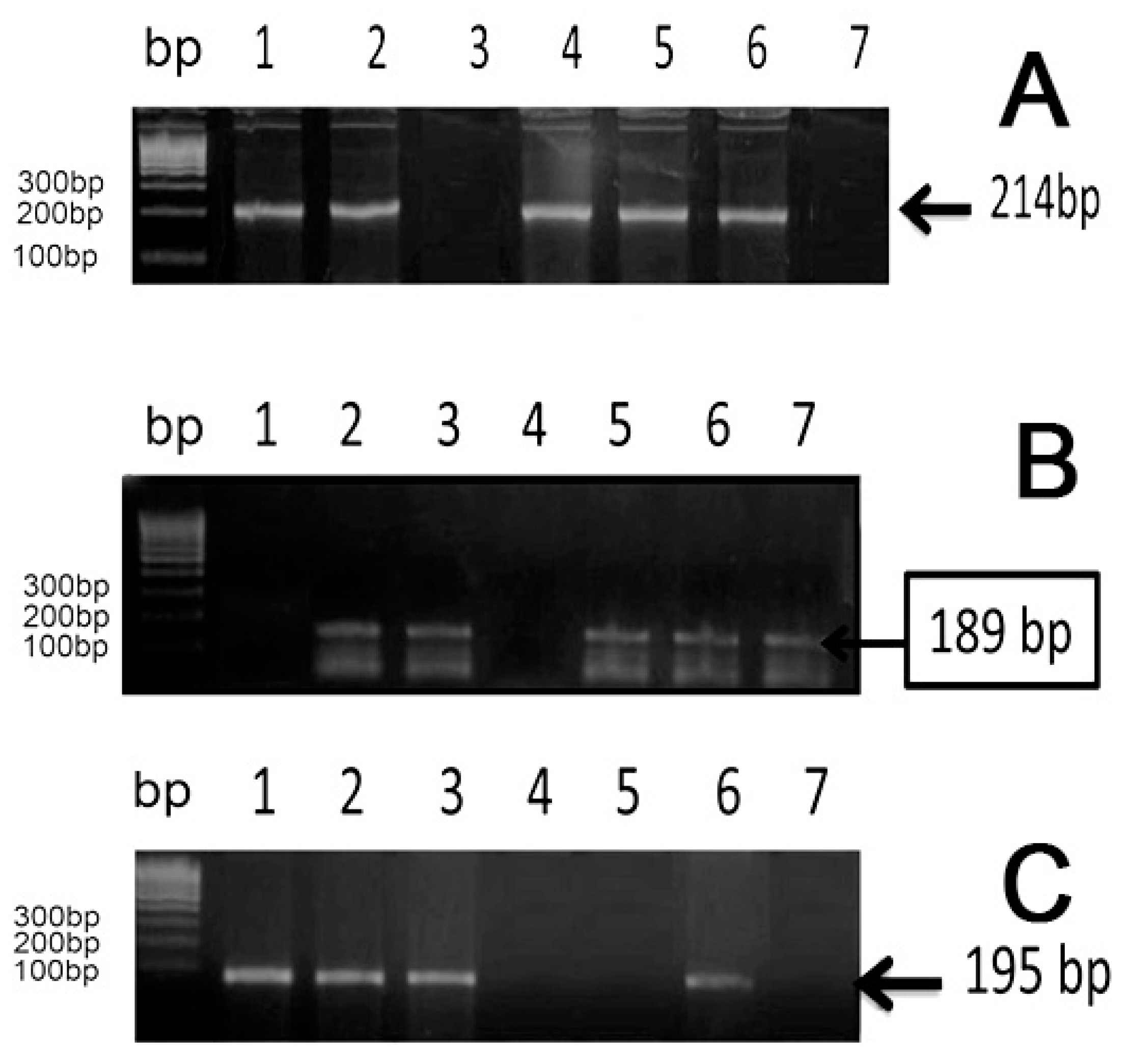 The amplified products were separated by electrophoresis on 2% agarose gel prepared in 0.5X TBE buffer and stained with SYBR Safe. The gels were photographed under UV transillumination.