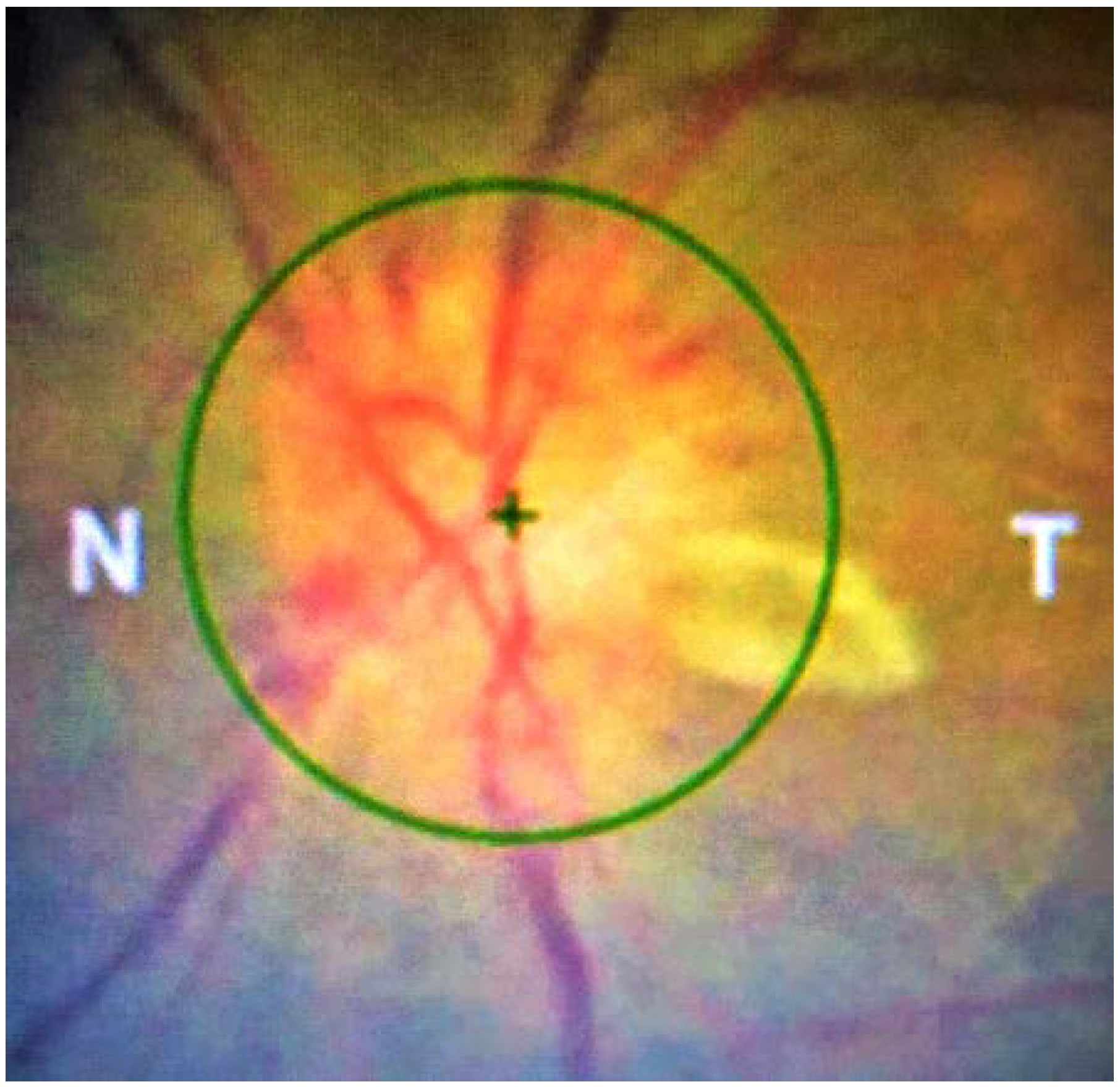 Ocular coherence tomography (Topcon 3D-2000, Topcon Corporation, Tokyo, Japan) of the left optic nerve head showed an importantly edematous optic nerve head associated with subretinal fluid around the optic disc and an important diffuse thickening of the peripapillary retinal nerve fiber layer (