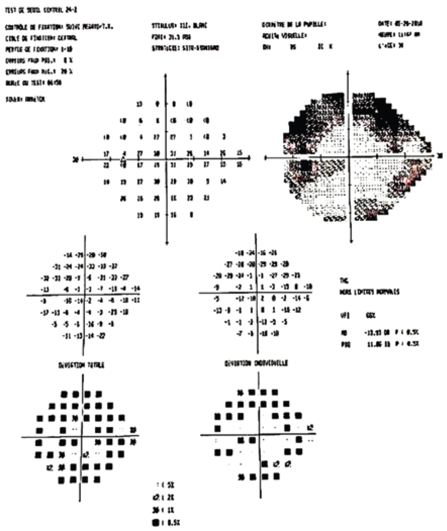 Left eye computerized visual field examination (24-2 Sita Standard, Humphrey field analyzer MODEL 740i, Carl Zeiss Meditec, Inc, Dublin, CA, USA) revealed an enlarged blind spot, a dense altitudinal superior scotoma and a slight diffuse reduction of sensitivity in the inferior hemifield. Right visual field was normal (