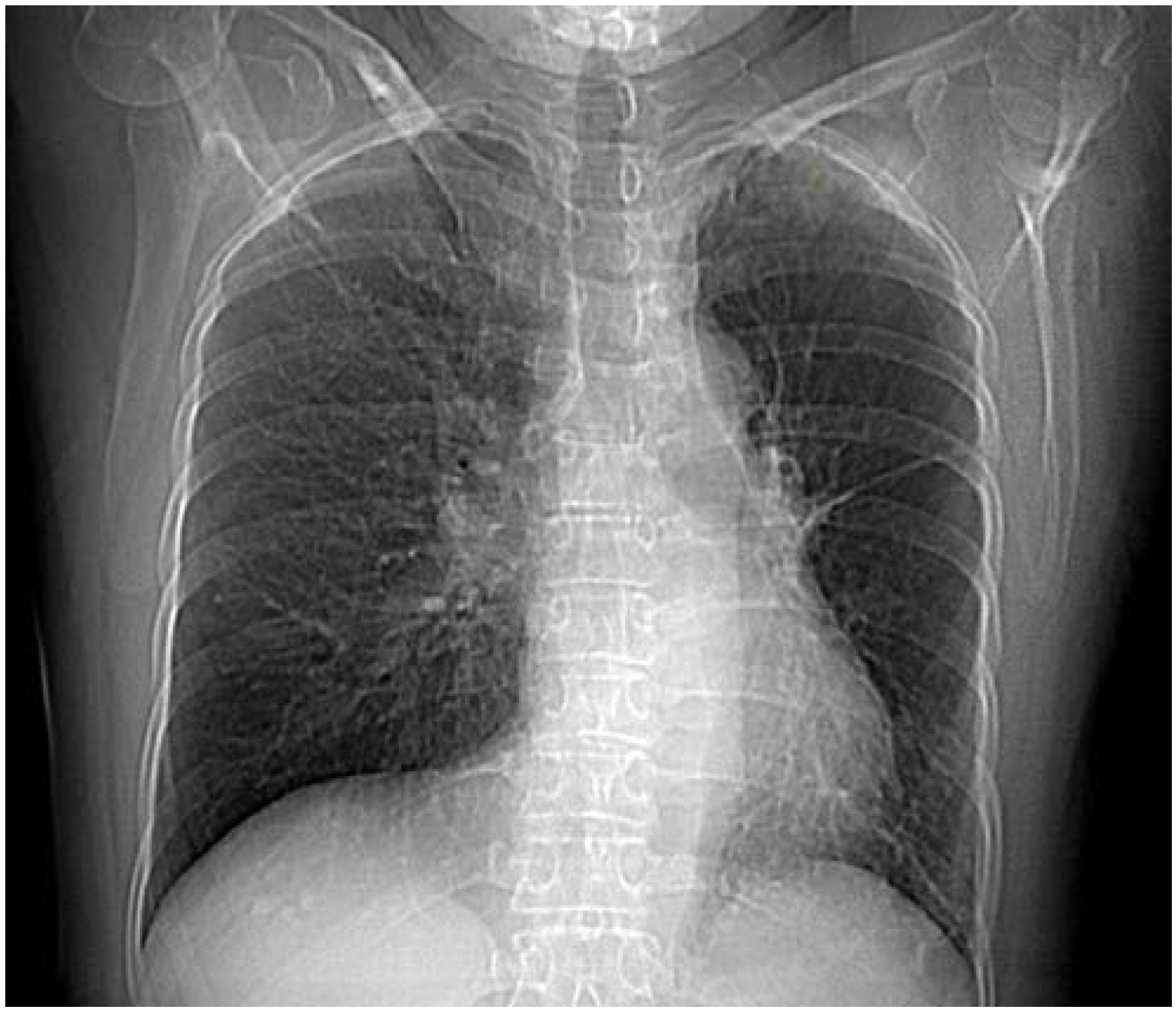 A 60-year-old female patient was admitted to our clinic due to hemoptysis followed by weakness and dyspnea. In childhood she had been treated for tuberculosis (TB). She had a 30 pack-year smoking history. She reported no other known illnesses. She was aware of penicillin allergy.