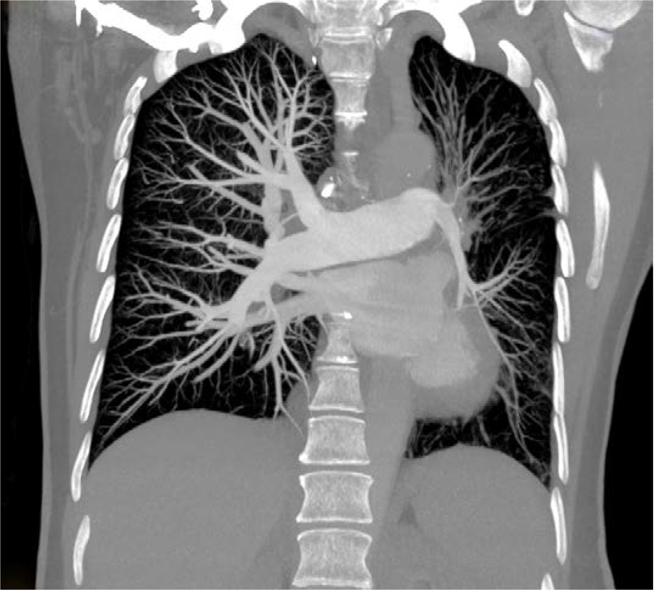 Thorax computed tomography (CT) revealed asymmetry with significantly smaller left lung. The left pulmonary artery immediately after separation was of extremely narrower lumen and so were lobar and segmental branches (