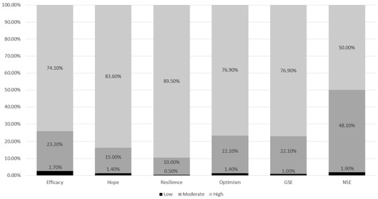 The outcomes of the PCQ-12, GSE-10, and NSE-8 highlighted that among the cohort of nursing students, 85.0% had high levels of overall psychological capital scores (scores ≥ 24) (x̅ = 18.69, SD = 2.71) followed by 76.9% who had high levels (scores ≥ 31) of general self-efficacy (x̅ = 31.89, SD = 3.89), while 50.0% of students were shown to have a high level of nursing self-efficacy (scores ≥ 24) (x̅ = 23.91, SD = 3.01) as outlined in Figure 1.