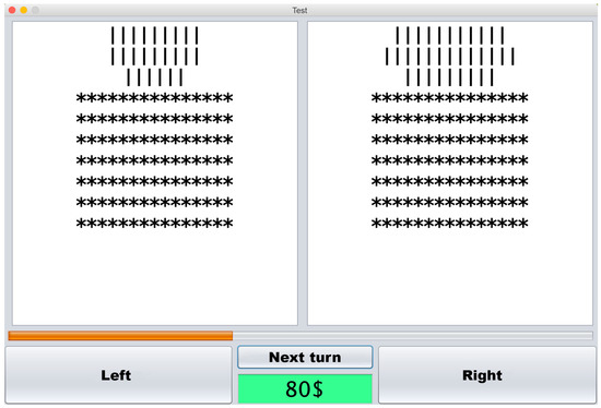 Computerized modification of Azarov’s [26,27] cognitive decision threshold-measuring task was developed to serve as a prognostic task for our research. In this modification, the task was presented on a monitor screen, which was divided vertically into two halves. On both parts of the screen, 10 identical rows, consisting of “*” symbols were displayed. At the beginning of the task, the first rows were opened on both halves of the screen simultaneously, revealing sets of vertical lines, different in both halves of the screen. Differences in the number of lines between the left and right parts of the screen could vary from 0 to 5 at each step of the task. The first row was displayed for 7 s, after which the second row would open, and so on. The time interval between the opening of the rows was enough for the participant to see the whole picture but too short to count the exact amount of the lines, so the decision had to be made on the general impression. The participant’s goal was to predict which half of the screen would contain more vertical lines after all rows were opened. The selection was made by pressing the button at the bottom of the corresponding half of the screen (See Figure 1).