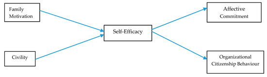 On the other hand, civility at workplace is identified as driver of positive individual and organizational outcomes [27]. Civility at workplace refers to employees’ courteous, respectful and caring behavior towards each other in formal and informal social relations [27]. It is not only being polite but being able to disagree without being disrespectful. It is the tool to solve problems and discuss ideas [28]. Civility fosters positive outcomes like thriving, performance, organizational citizenship behavior and health [27,29] and has its importance in customer service, problem solving, team building, relationship and trust building [28]. Despite the physiological, psychological and relational benefits of civility at the workplace, few empirical studies have concentrated the beneficial outcomes of civility in management literature [27]. Moreover, civilty is culture and time sensitive as what is considered civilized at one time in a particular culture may not be so in the other culture at some other time period [28]. Therefore, construct of civility is required to be addressed according to time, situation, culture with due importance given to acceptable standards. In response to the above gaps in the literature, the present research identifies civility at the workplace as the determinant of affective commitment and organizational citizenship behavior. More importantly, this study explores the mechanism through which family motivation and civility result in aforementioned positive consequences by examining the mediating role of self-efficacy.