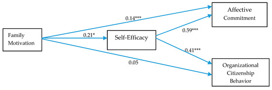Hypothesis 2 was related to the mediated mechanism between family motivation and OCB. Results show that family motivation significantly predicts self-efficacy (β = 0.21, p < 0.001) but does not directly OCB, β = 0.05, p > 0.01, CI95% confidence level (−0.02, 0.13); self-efficacy also significantly predicts OCB (β = 0.41, p < 0.001). For the indirect effect, β = 0.08 falls between 0.04 and 0.13. This range does not include zero; therefore, the indirect effect is significant, so the relationship between family motivation and OCB is mediated y self-efficacy. Hypothesis 2 is supported.