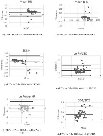 Effect size interpretation indicated trivial differences between the two devices for mean R-R and mean HR. Results revealed significant differences between the PPG finger monitor and the Polar H10 chest strap for all analyzed HRV parameters. This lack of agreement between devices was consistently demonstrated for those HRV parameters with strong PNS contribution, with effect sizes indicating moderate differences for SDNN, LnRMSSD, LnHF and SD1/SD2.