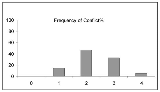Teachers’ perceptions on the frequency of conflicts in their school units are presented in Figure 2. The frequency of conflict occurring in schools was assessed according to the scores of teachers’ answers (0 = never; 1 = rarely; 2 = sometimes, 3 = often; 4 = frequently). A score above 3 indicates an often/frequent occurrence of school conflict. A significant number of teachers (38.28%) reported an often/frequent occurrence of conflict in their school.