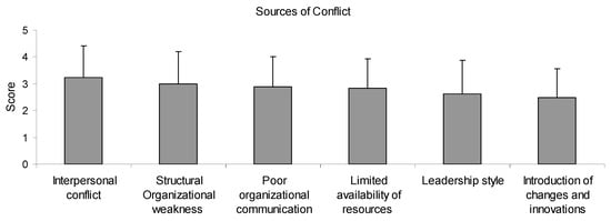 Teachers’ perceptions on the sources of school conflict was assessed according to the scores of their answers (0 = never; 1 = rarely; 2 = sometimes, 3 = often; 4 = frequently) on a range of possible sources: interpersonal conflict; structural organizational weakness; poor organizational communication; limited availability of resources; introduction of changes and innovations; leadership style (Figure 3).