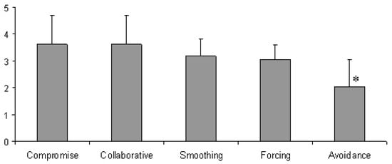 Compromise (3.63) and Collaborative (3.63) styles were often/frequently used, followed by Smoothing (3.20), Forcing (3.05), and Avoidance (2.05), which were often and sometimes exhibited by school leaders. Statistical analysis (Tukey’s HSD post-hoc tests, p < 0.05) indicated that, compared to the other conflict management styles, Avoidance exhibited significantly lower scores, indicating that this conflict management style was less frequently exhibited by school leaders.