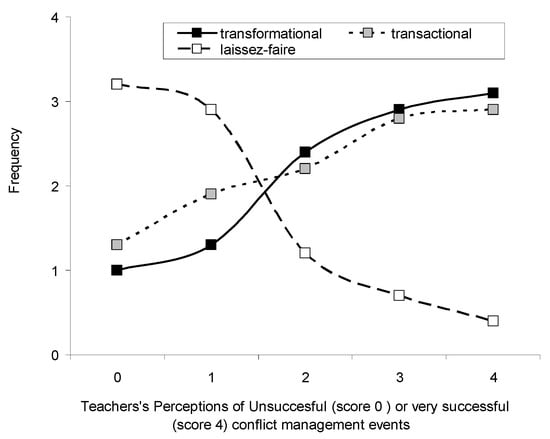 Transformational and transactional leadership styles were perceived by teachers as equally effective in successful conflict resolution, whereas the laissez-faire leadership style was not. These results are in agreement with previous reports on the inferiority of the laissez-faire leadership style and the expected benefits of transformational leadership on effective school management [16,17,18].