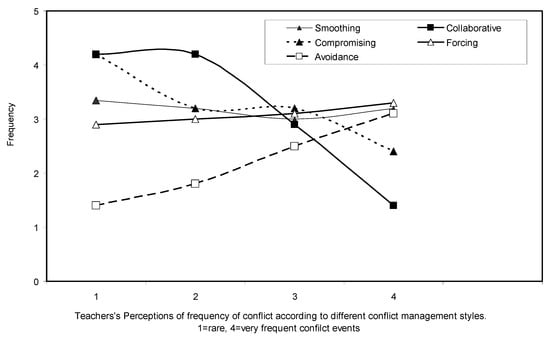 Conflict management style and frequency of school conflicts according to teachers’ perceptions. Lines represent different conflict management styles: Smoothing (solid line with black triangles), Compromising (dotted line with black triangles), Collaborative (solid line with black squares), Avoidance (solid line with white squares), Forcing (solid line with white triangles). Scores range from 1 (rare conflicts) to 4 (very frequent occurrences of school conflicts).
