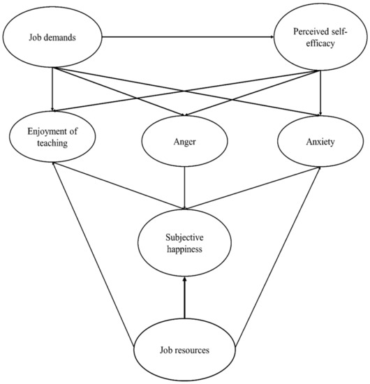 The present paper aimed at developing a comprehensive model of pre-university teachers’ well-being. The proposed model includes a relevant and significant selection of variables: job demands; job resources, perceived self-efficacy, subjective happiness, and teaching emotions. Hence, the model postulates that the perceived level of job demands (independent, exogenous variable) affects the perceived self-efficacy (mediator variable) and both variables influence the teaching emotions (dependent variables). Complementing this, the model proposes another exogenous variable—job resources—influencing teachers’ happiness and enjoyment of teaching. In addition, the model draws a relationship between enjoyment of teaching and subjective happiness.