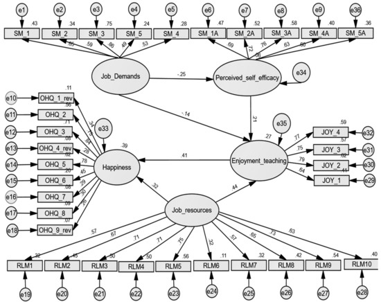 In order to confirm the findings of the exploratory factor analysis, a two-step structural equation modelling with maximum likelihood estimation was performed. The initial statistical model tested with Amos (IBM, New York, NY, United States), included 40 observed variables, five unobserved endogenous variables (namely subjective happiness, enjoyment of teaching, anger, anxiety, and perceived self-efficacy), and two unobserved exogenous variables (job demands and job resources). The initial structural model displayed acceptable fit (Table 9): ). The normed chi-square is 4.303, being close to the upper threshold of 5. The RMSEA value can be considered very good. The RFI index is lower than 0.8 ( but the other indices are above the lower threshold.
