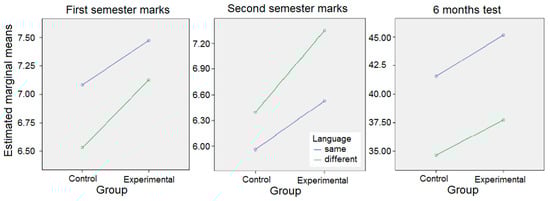 In the 2-way ANOVA testing, having as independent variables the group (experimental or control) and the language of study (different or the same as the first language), a statistically significant relation is noticed (p < 0.05) given by each variable and students’ grades in every semester, as well as in the 6-month testing. If the presence of interference between the variables, even if statistically insignificant, is detected in the semester tests, these interferences disappear completely at 6-months testing.