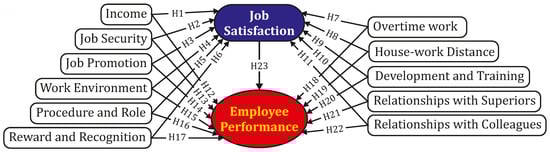The recent changes in the business context, especially the fierce competition on the marketplace, require every business to continuously improve themselves for their own survival and growth. Furthermore, improving employee performance is one of their preferred approaches to gain their competitive advantages. Hence, all business organizations are making a special effort to fully identify the determinants of employee performance so that they can create proper policies and actions to improve their performance. The research objectives of this study well aligned with the practical demand. Specifically, in the empirical case of garment enterprises in Binh Duong industrial parks, through common analyses such as scale reliability analysis, exploratory factor analysis, confirmatory factor analysis and structural equation modeling, it was found that job satisfaction is positively affected by eight factors: (1) reward and recognition; (2) development and training; (3) job promotion; (4) income; (5) work environment; (6) relationship with superiors; (7) relationship with colleagues; and (8) work procedure and role. In addition, it is negatively affected by the house–work distance and overtime work, which are two new factors proposed in this study. Besides these ten factors, employee performance was also found to be influenced by the job satisfaction.