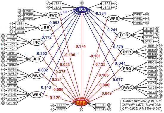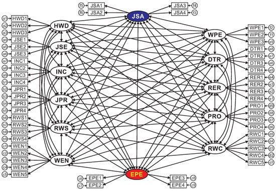 The results of the model estimation and bootstrapping in the SEM shown in Table 10 clearly indicate that the obtained regression coefficients (except those of JSE → JSA and JSE → EPE) are statistically significant as their respective p-values are less than 0.05. Consequently, 21 out of 23 stated hypotheses (except H2 and H13) are supported.