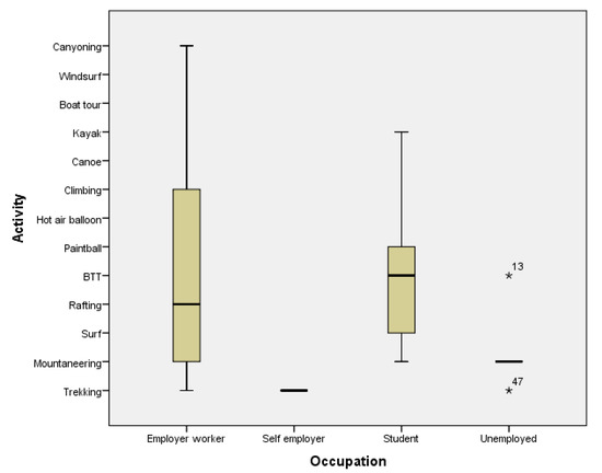A Pearson’s chi-square test was carried out in order to verify whether the activities practiced were correlated with the demographic variables. As shown in Table 4, the only demographic variable with a significance level lower than 0.05 is occupation. Students are more likely to practice surf, rafting, BTT, and paintball, while unemployed people are more inclined to mountaineering and employed workers prefer more activities (Figure 1). The remaining variables do not show any statistically significant difference.