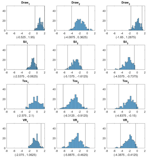 Histograms and 95% confidence intervals obtained by bootstrap for the difference between the BMI selected from each image type and the true BMI (Draw = hand drawing, Sil = silhouette, Tex = textured silhouette, and VR = virtual reality). The three columns correspond to Question 1 (Which figure best reflects how you think you look today?), Question 2 (Which figure is the size and shape that you would most like to be?), and Question 3 (Which figure is the size and shape that you feel would be most realistic for you to maintain?), respectively. The two vertical lines in each plot correspond to the lower and upper bounds of each confidence interval, respectively.