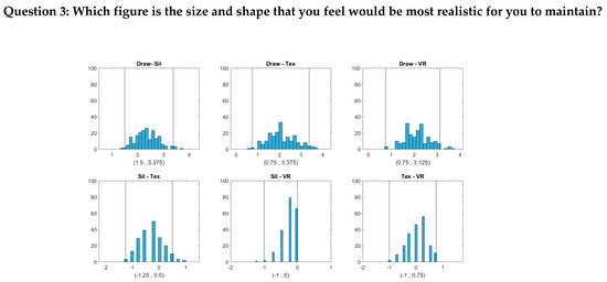 Figure 3 shows that for Question 1 (Which figure best reflects how you think you look today?), the BMI values chosen by subjects were most accurately aligned with their actual body shape in the 2D textured and 3D VR conditions, as indicated by the zero point of the difference scores being approximately in the center of the distributions and well within the 95% confidence intervals. For the hand-drawn condition, response BMI values were somewhat overestimated relative to the physical BMI, although not significantly (the zero point fell within the 95% confidence interval, albeit near the lower boundary). For the silhouette condition, response BMI values significantly underestimated the physical BMI. For both Question 2 and Question 3, people tended to select significantly lower BMI values than their real ones for most image types. For Question 2, responses in the drawing condition did not differ significantly from zero, although there was a tendency toward lower BMI values, similar to the other conditions. Thus, there was a general tendency to desire a smaller body size than the current size. For Question 3, for the silhouette, 2D textured, and 3D VR conditions, subjects again chose significantly lower BMI values than their current BMI. Responses for the drawing condition, meanwhile, did not differ significantly from the current BMI.