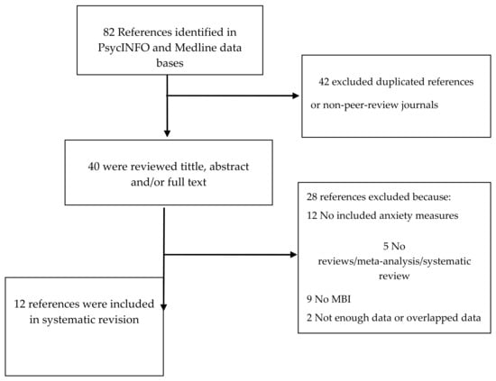 A total of 82 potentially relevant records were retrieved in the literature search. After screening all by title and abstract and removing duplicates and studies not subject to peer review, a total of 40 references were identified (Figure 1). Of these, most were excluded either because they did not report pertinent outcome measures, they did not refer to anxiety disorders, interventions based on the mindfulness technique were not applied, or not enough results data were provided. Twelve articles were considered eligible for inclusion through this combined search strategy. The methodological quality of these reviews was examined using the AMSTAR tool [38]. Table 2 summarizes the responses to the AMSTAR items. As can be observed, 10 reviews reached the required methodological quality in more than half of the items, and six of those studies obtained a positive rating in eight or more items. Only two reviews showed clear methodological insufficiencies.