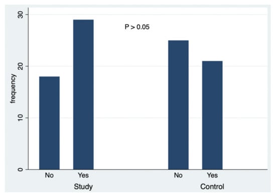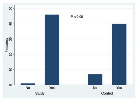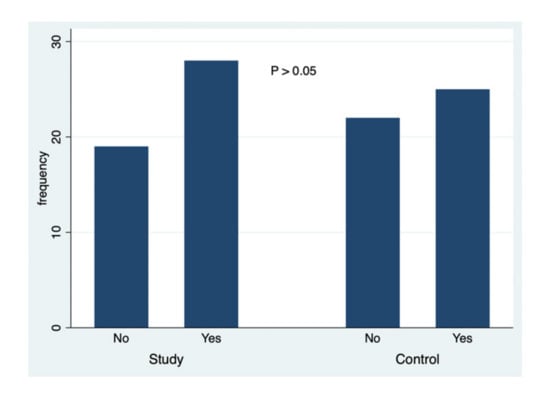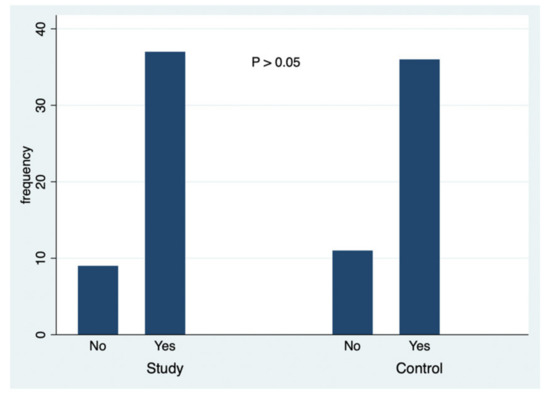 Regarding the sun protection factor (SPF), there was no statistically significant difference among the different responses and between the groups (p = 0.729) and the answer was correct: SPF ≥ 30. Concerning the question about who should use sunscreen daily, there was also no statistically significant difference between the groups (p = 0.330) and between the responses. A statistically significant higher number of students answered that all people (infants, children and adults) should use sunscreen daily. The correct answer was “all the people from 6 months of age”. In the last SPF item, most respondents correctly answered that “sunscreen application should be renewed every 2 h”, but there was no statistically significant difference between the type of responses and each group (p = 0.593). The SPF provides strong protection against the development of skin cancer [39] and sunscreen application should be renewed every 2 h [40]. In response to the question “Have you ever had a sunburn?” (Figure 6) 37 students from the study group and 36 from the control group reported to have already had a sunburn; thus, there is no evidence of health behaviors in the study group (p = 0.652), which is surprising as both groups answered that sunscreen was important, without differences (p = 0.309).