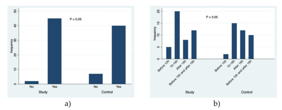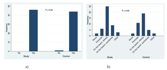 Regarding the knowledge about the relevance of the use of sunscreens (Figure 4a), most of the students from both the study and control groups perceived the use of sunscreen to be important, with no statistically significant difference between them (p = 0.309). Regarding how much time should the sunscreen be applied before sun exposure, the study group selected the answer “15 min before sun exposure”, which is the correct response, with statistical significance in relation to the control group (p = 0.006); 26 students from the study group chose the “15 min earlier” answer and in the control group 18 students chose the “15 min earlier” answer. Concerning the question about when sun exposure should be avoided, there was no statistical significance between groups and between the different responses (p = 0.0787). Students in both groups tended to correctly answer, “sun exposure should be avoided between 10 AM and 4 PM regardless of whether we use sunscreen”. Thus, there is no concordance between what they consider as correct (avoid sun exposure between 10 AM and 4 PM) and what they usually do (Figure 3b, they expose themselves to the sun between 10 AM and 4 PM). In addition, both groups answered that sunscreen application should be done every day (Figure 4b) during the summertime at the beach (with statistical significance in relation to other responses), and there was no statistical significance compared to the control group even though the correct answer would be every day when one is outside (p = 0.123).