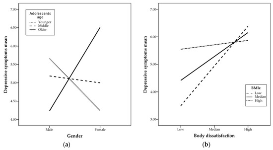 Simple slopes of moderation analysis: (a) relationship between gender and depressive symptoms at three age levels, younger (16th percentile, 12 years), median (50th percentile, 13 years) and older (84th percentile, 15 years) adolescents, statistically significant for older adolescents, p = 0.037; (b) relationship between body dissatisfaction and depressive symptoms at three levels of BMIz (body mass index z-scores), low (16th percentile, BMIz = −0.86), median (50th percentile, BMIz = 0.13) and high (84th percentile, BMIz = 1.35), statistically significant for low, p = 0.004, and median, p = 0.012, BMIz. Values of body dissatisfaction were Low = 0, Median = 1.25 and High = 2.
