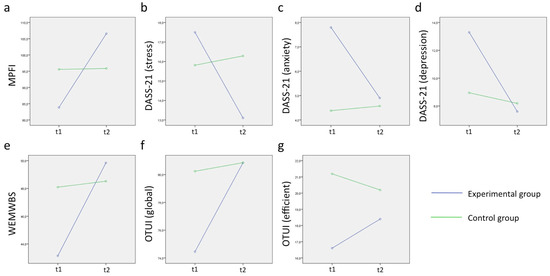 In order to test the effect of the program on psychological flexibility, mental health, and well-being, we ran a mixed repeated measures ANOVA considering both time (t1, t2) and group (intervention, control). We focused on the interaction term of this ANOVA between time and group. The time*group interaction showed a change in one group (and not the other) between time t1 and t2 (see Table 6). Psychological flexibility significantly increased in the intervention group between t1 and t2, and mental health scores (DASS-21) were reduced between t1 and t2 in the intervention group, although this was significant only for the depression score, while changes were marginally significant for stress and anxiety scores (Table 6 and Figure 1). The well-being score (WEMWBS) significantly improved in the intervention group between t1 and t2 (Table 6 and Figure 1).