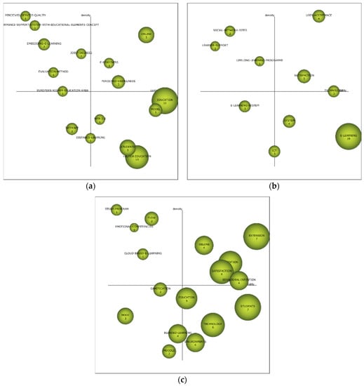 In the first interval (2000–2011), the driving themes are “perceived-usefulness”, which is related to “impact”, “technology-acceptance-model”, and “user-acceptance”; “e-readiness”, which is based on “measuring-e-readiness”, “cultural-aspects”, and “IT”; and “on-line” which is oriented towards “qualitative-differences”, “knowledge-work”, “teaching-quality”, “technology”, “satisfaction”, “conceptions”, “teaching/learning-strategies”, and “face-to-face”. In this period, although ELHI is analyzed, it seems that the research interest is more oriented towards distance learning than e-learning.