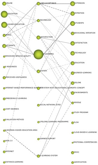 The scientific evolution of ELHI presents a conceptual gap. This is due to the fact that there is not one theme that is repeated in the three periods. Even so, two lines of research can be glimpsed, on the one hand that established by “model-user/acceptance-extension/behavioral-intention” and—on the other—that of “students-e/learning-students”. In other words, studies in this field of study are mainly oriented towards the acceptance of the pedagogical model and in the students themselves. Furthermore, as can be seen in Figure 4, there is a shift from elements of distance learning to aspects of e-learning. It can also be seen how terms such as social networks, learning for life, and learning platforms appear, which shows the variety of resources and the purpose of this type of teaching method. It should be borne in mind that there are more conceptual than non-conceptual connections.