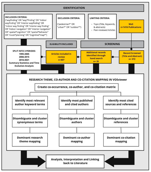 The search results were limited to articles in addition to limiting to the “topic section” (title, keywords, and abstracts) to identify publications mainly focusing on indoor wayfinding. While this search might not retrieve all related publications, it found the publications in which the researcher(s) have the main focus of wayfinding and navigation in a physical indoor environment. Since the focus of this study was indoor environments, the studies that focused on the outdoor urban environment were filtered out by adding exclusion terms (“pedestrian”, “urban”, and “outdoor”) to the query. The search was conducted on 19 April 2021, based on the abstracts, keywords, and titles of research papers (only in English) that have been indexed since 1965. There were 1416 papers retrieved from the following Web of Science (WoS) databases: Science Citation Index Expanded, Social Sciences Citation Index, Arts and Humanities Citation Index, and Emerging Sources Citation Index. These databases have been selected for two main reasons: (1) they are well-recognized in academia for archiving quality peer-reviewed research; (2) the software tools available for text mining and bibliometric analysis can only process bibliographic outputs generated by these databases.