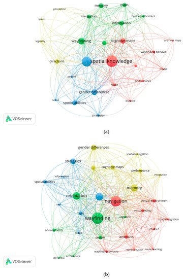 To detect the thematic clusters of the topic of indoor wayfinding, term co-occurrence analyses were conducted. This bibliographic method is useful to detect the major core concepts and identified topics, and it can be used to define the thematic clusters [61]. Using the software enabled us to specify the thematic clusters according to the strength of the connections between the terms. The co-occurrence frequency of the terms shapes the clusters. This requires previous knowledge of the field, an understanding of the evolution of wayfinding over time, and the use of advanced technological methods. The output of the VOSviewer analysis is shown in Figure 2. The node sizes are proportional to the number of terms. Some of the general keywords that might have occurred in the publications and were not related directly to the subject were eliminated from the keywords (e.g., “performance”, “strategies”, “model”). The frequency of co-occurrence of the top 20 highly occurring terms is presented in Table 1.