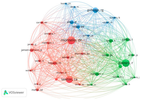 The co-citation analysis using cited authors was conducted to identify the most influential authors in indoor wayfinding literature. The list of the 30 most prominent authors with a minimum of 20 citations is presented in Table 3. Figure 7 also demonstrates the most influential authors related to indoor wayfinding. Three main clusters can be identified according to the author’s expertise. The results of this analysis are, to a great extent, consistent with the results of the previous section analysis (Prominent Publications). The green cluster includes authors that have mainly worked on the nature of wayfinding and the syntax of space and its impact on navigation (such as Romedi Passini, Kevin Lynch, Paul Arthur, Christoph Hölscher, Tommy Garling, Jerry Weisman, John Peponis, and Bill Hillier). The red cluster of this analysis includes the authors that have expertise in investigating individual differences (gender and sex) and children’s wayfinding behavior (e.g., Daniel Montello, Petra Jansen-Osmann, Carol Lawton, Mary Hegarty, Scott Moffat). This cluster also includes some studies by authors that focus on differences in spatial knowledge, route learning, and the role of landmarks, such as Perry Thorndyke, Jan Wiender, Toru Ishikawa, and Tobias Mellinger. The third-largest cluster (blue) includes authors whose expertise revolve around spatial knowledge, place recognition, and cognitive maps, such as Reginald Golledge, Alexander Siegel, Gary Allen, and Martin Raubal.